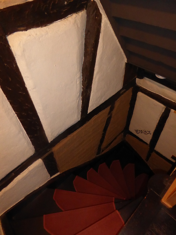 Über eine Holztreppe gelangt man zum Obergeschoss.
