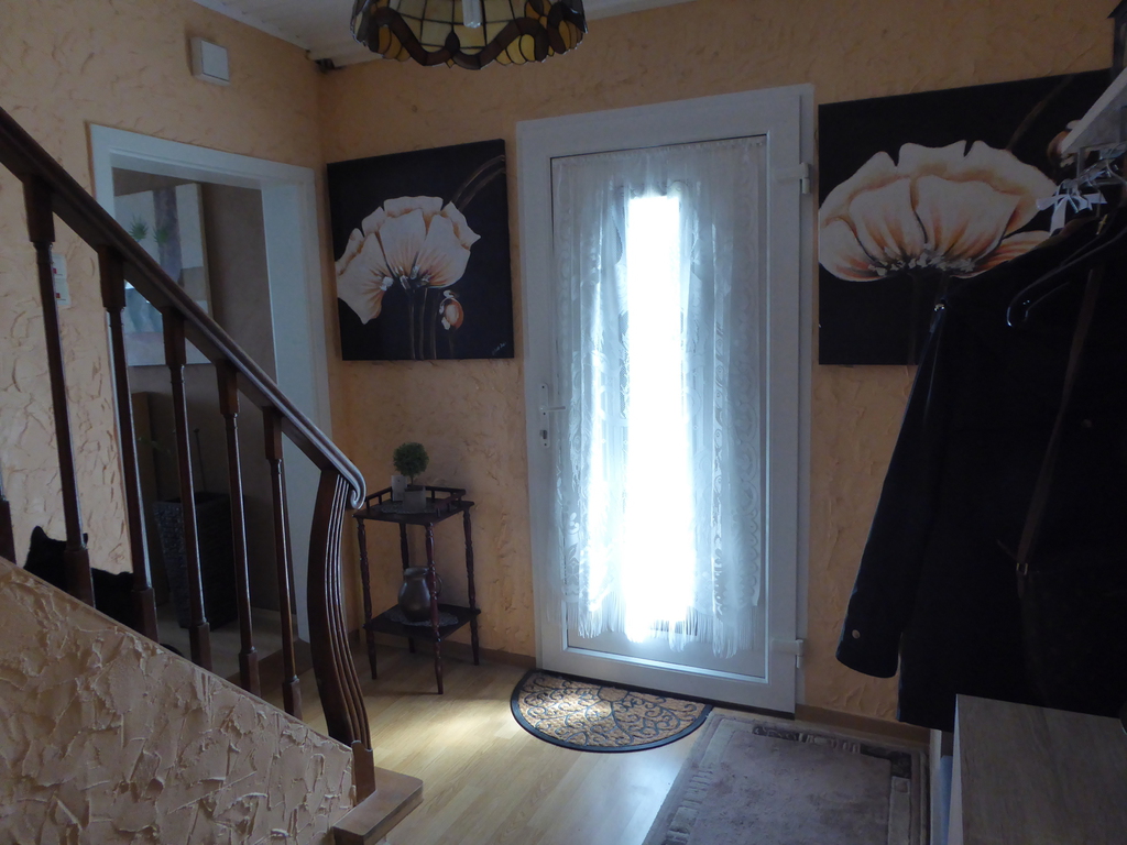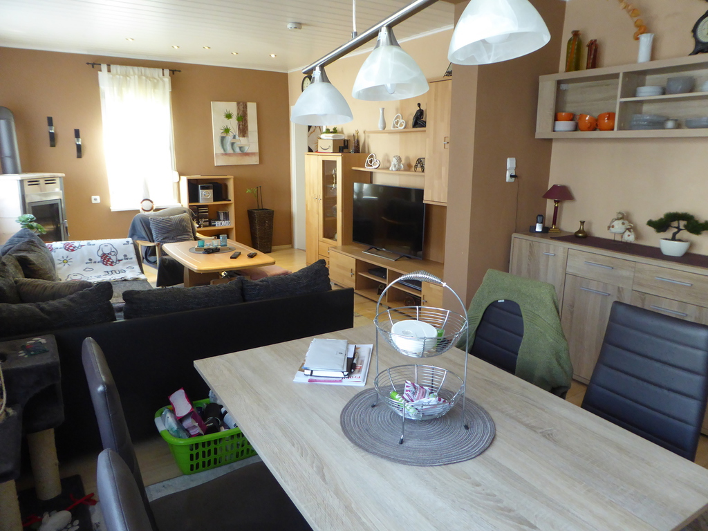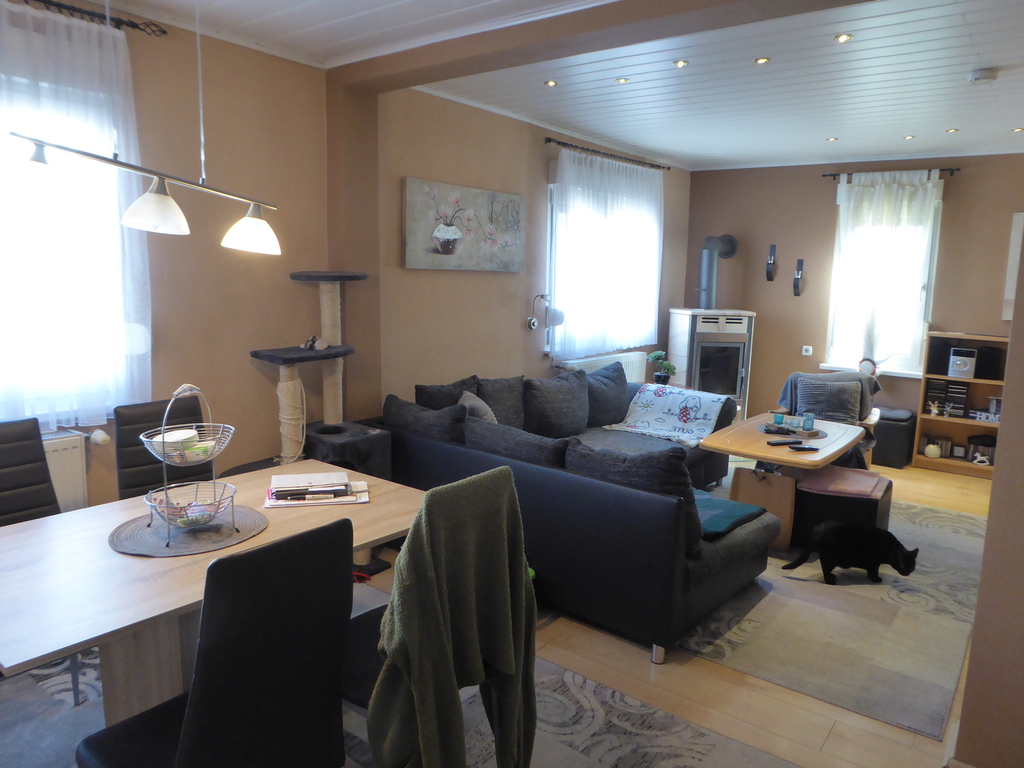 Im Erdgeschoss befindet sich eine Diele, der großzügige Wohn- /Essbereich mit Kaminofen, die Küche mit Durchgang zur Garage