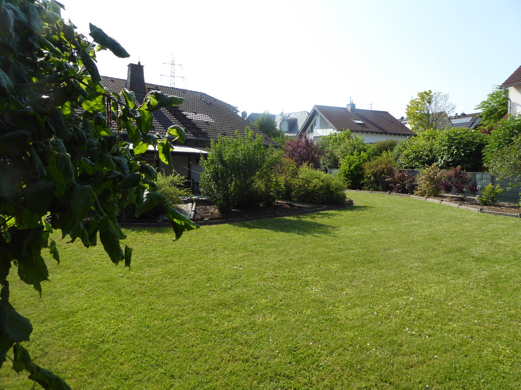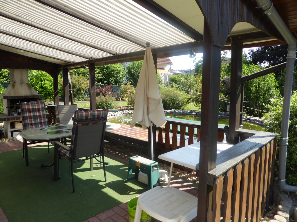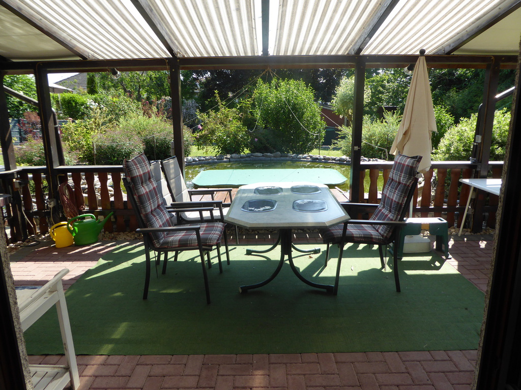 teich, eine große Rasenfläche sowie 2 Gartenhäuschen.