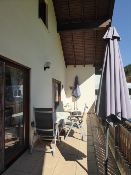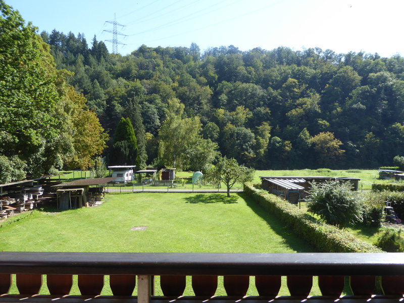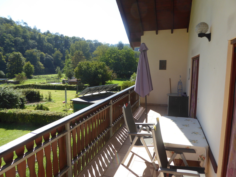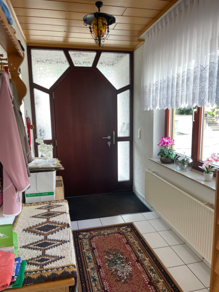 je einen Zugang zum überdachten Balkon – von hier aus hat man einen tollen Blick über das Grundstück und die Lahnauen. Der helle Eingangsbereich ist groß-