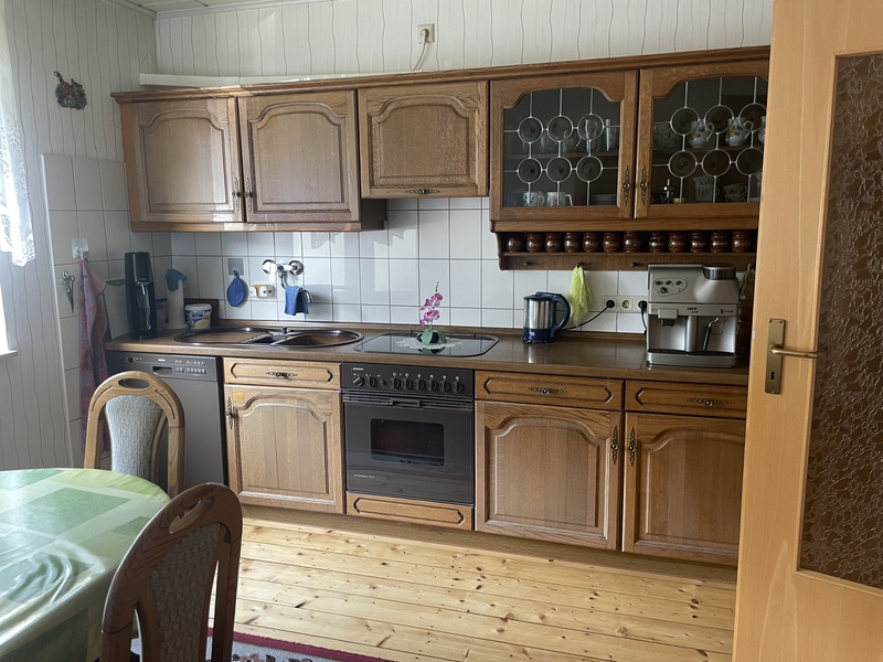 man in die gemütliche Wohnküche mit Dielenboden sowie in das angrenzen-
