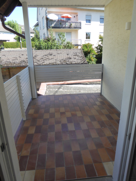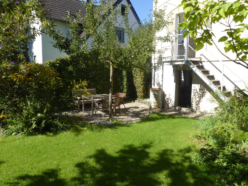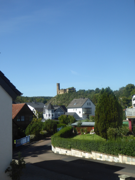 Blick zur Burg Aardeck, ein Schlafzimmer, die Küche mit sehr schöner Einbauküche (im Preis enthalten) und Ausgang zum Garten, ein Abstell-