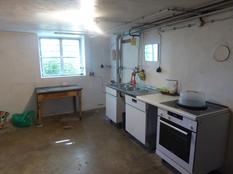die Waschküche mit WC und Ausgang zum Garten. Der Anbau ist nicht unterkellert.