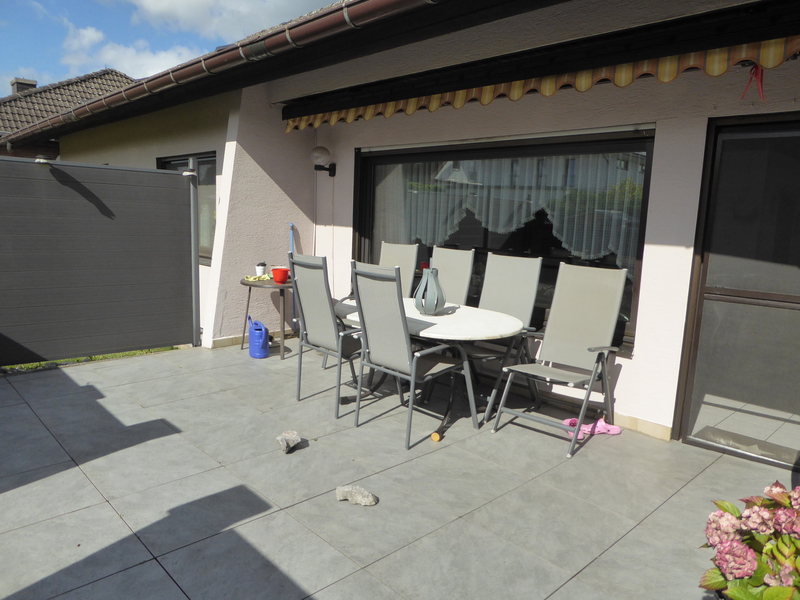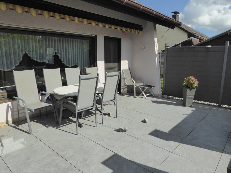 * große Terrasse (2022 erneuert) mit Fliesen, Markise und