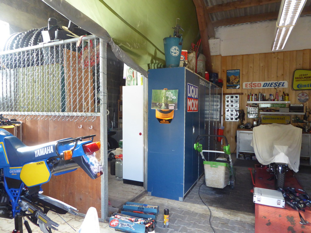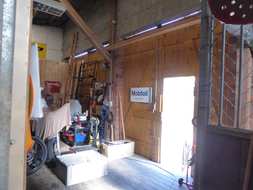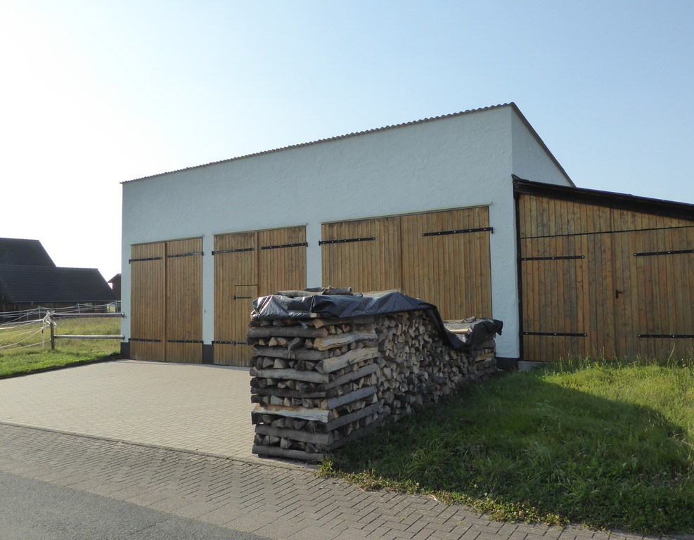 Im vorderen rechten Teil des Grundstücks befindet sich eine kleine Halle, die unter anderem als Stallung für Pferde genutzt wurde (Boxen sind teils noch vorhanden). Die Halle hat eine Fläche von ca. 80 m², ist mit Hohlblocksteinen massiv gebaut und verfügt über einen Stromanschluss. Der Boden sowie der Platz vor der Halle (3 Stellplätze) sind gepflastert. Die Zufahrt erfolgt über drei große Tore. Derzeit ist die Halle vermietet und wird als Werkstatt genutzt. Der Mietvertrag ist zum 31.12.2024 gekündigt. Der kleine Anbau-Schuppen dient als Holzlager.