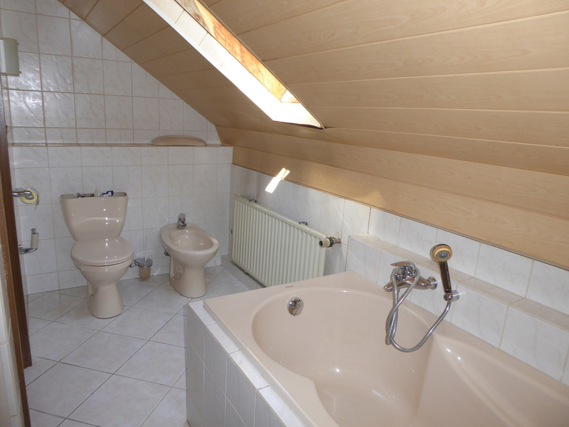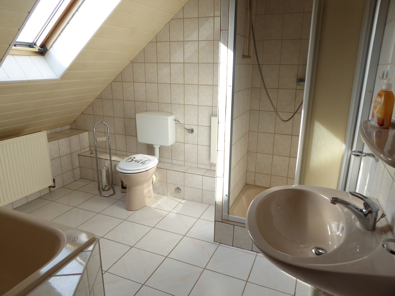 Küche. Das Obergeschoss bietet zwei Schlafzimmer und ein Tageslichtbad mit Wanne und Dusche. Im Dachgeschoss gibt es