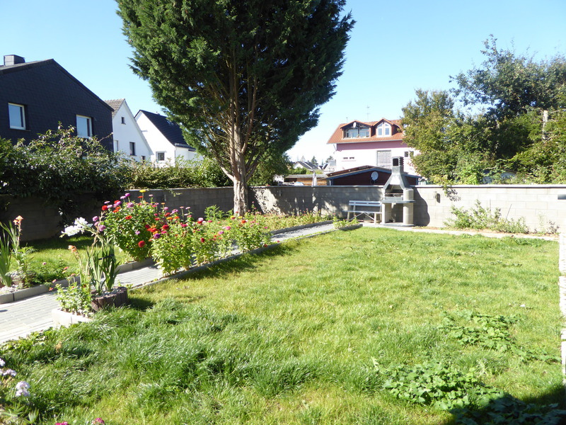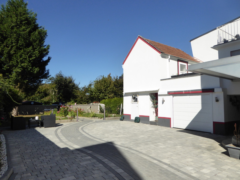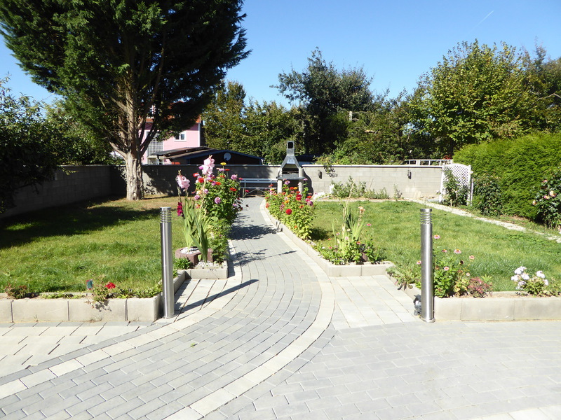 Das Grundstück hat eine Größe von 466 m². 2016 wurde die Außen-anlage mit viel Aufwand liebevoll neu gestaltet. Der vordere Bereich wurde mehrfarbig gepflastert und bietet außer der Zufahrt auch eine schöne Terrasse, die zum Verweilen einlädt. Der gepflasterte Weg führt durch das komplette Grundstück und ist zum einen mit in den Boden eingelassenen Strahlern sowie mit mehreren frei stehenden Leuchtsäulen versehen, so dass man das gesamte Grundstück abends beleuchten kann.