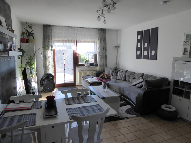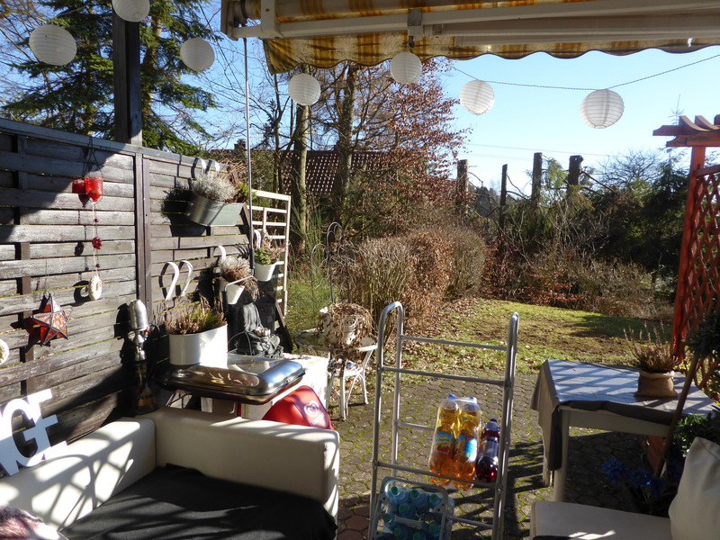 eine Ständerwand in zwei Räume unterteilt. Diese kann mit geringem Aufwand wieder entfernt werden. Sowohl vor dem Essbereich, als auch vor dem Wohnzimmer befindet sich eine Terrasse mit Zugang zum Garten.