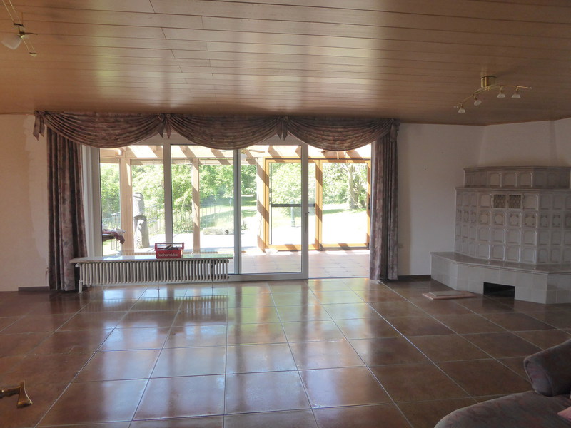 Im Erdgeschoss befindet sich ein Windfang, eine geräumige Wohndiele, das 60 m² große Wohnzimmer mit Zugang zum Wintergarten, eine 20 m² große Küche mit angrenzendem Esszimmer und der Zugang zur großen Terrasse mit wunder-schönem Fernblick. Ferner befindet sich auf dieser Etage eine zweite Küche mit Speisekammer, eine Garderobe und ein Gäste- WC. An den Wintergarten schließt sich eine Terrasse sowie der große Garten an. Die Wohnfläche im Erdgeschoss beträgt
