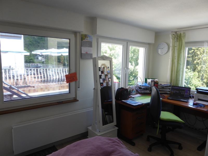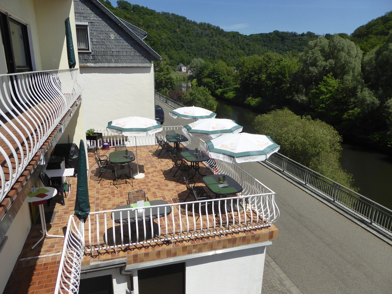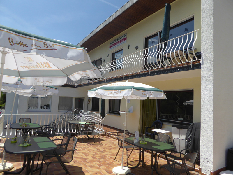Das ursprünglich ebenfalls als Einfamilienhaus genutzte Gebäude wurde 2015 zu einer kleinen Pension mit Gaststätte umgebaut. Es ist teilunter-kellert. Im Untergeschoss befindet sich eine Garage mit Grube und direktem Zugang zum Treppenhaus, eine Waschküche, der Heizungsraum und der Öllagerraum (4 x 1000 Liter). Auf der 1962 erstellten Doppelgarage entstand eine ca. 65 m² große Sonnenterrasse (mit eigener separater Außentreppe), die heute als bestuhlte Lahnterrasse bewirtschaftet wird und sehr gerne von Wanderern und Radfahrern zum Verweilen genutzt wird. Von hier aus hat man einen traumhaften Blick über die Lahn und zu den gegenüberliegenden Wiesen und Wäldern.
