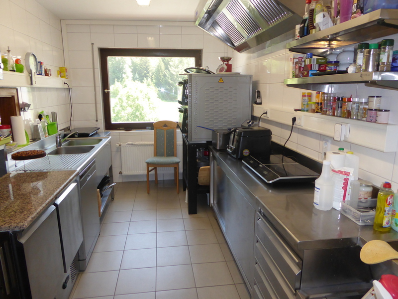 Im 1. Obergeschoss ist ein schöner großer Frühstücksraum mit Ausgang zur Sonnenterrasse entstanden. Die großen Fensterflächen lassen viel Licht in den schönen Raum, der derzeit Platz für ca. 25 Gäste bietet und auch gerne für Familienfeiern gebucht wird. Die 2015 neu eingebaute Gastroküche ist aufgrund flexibler Kochfelder auch für größere Gästezahlen ausreichend dimensioniert. Die Küche inkl. allem Inventar ist in dem Angebot enthalten.