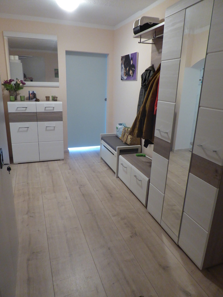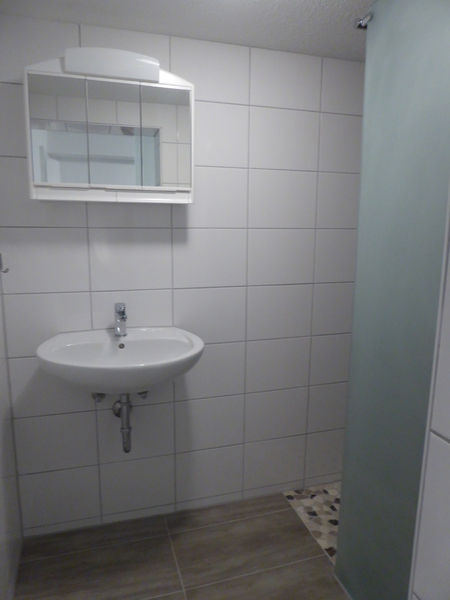 Im Untergeschoss ist ein Ferienapartment mit einer Größe von ca. 67 m² untergebracht. Es verfügt über einen Wohn-/Schlafbereich, eine sehr geräumige Wohnküche mit Essplatz, ein Baderzimmer und eine Diele. Das WC und die bodengleiche Dusche sind durch eine Leichtbauwand getrennt.
