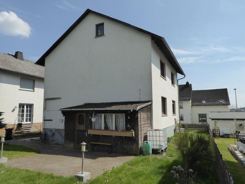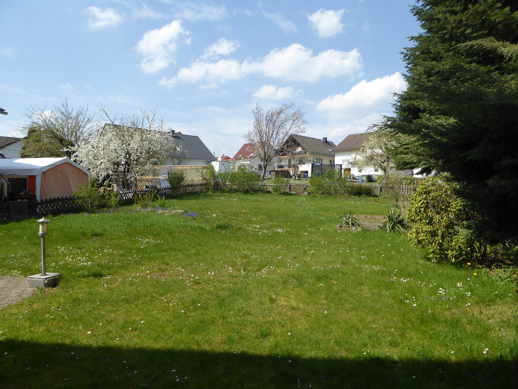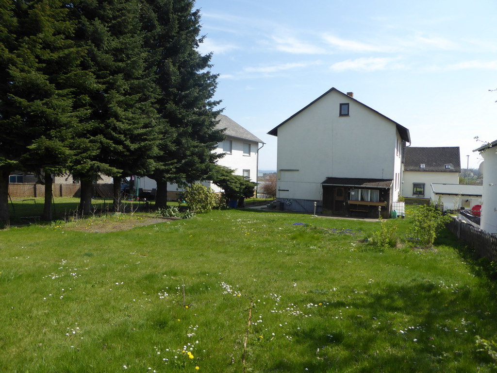 an einen befahrbaren Wirtschaftsweg an. Die Garagenzufahrt und der Hauszugang sind mit Verbundsteinen gepflastert. Hinter dem Haus gibt es eine geräumige Gartenhütte mit einer ebenfalls gepflasterten Terrassenfläche. Das Grundstück ist überwiegend als Rasengarten angelegt.