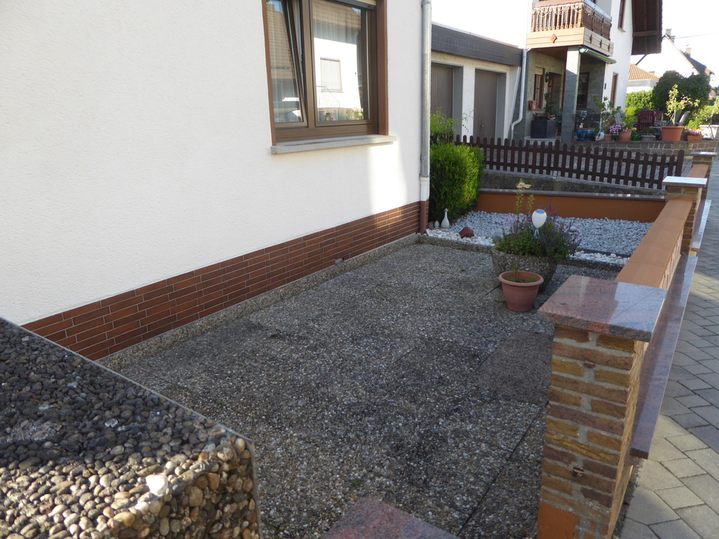 Das 208 m² große große Grundstück ist unterteilt in einen Vorgarten und eine gepflasterte Fläche vor der Garage und neben dem Wohnhaus.