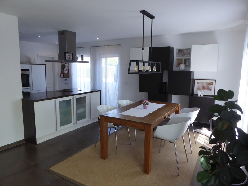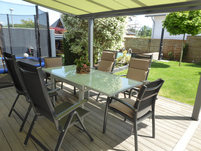 Die Eingangsebene bietet einen ca. 47 m² großen Wohn-/Essbereich mit integrierter Küche, einer Kaminecke und insgesamt 3 Ausgängen zum Garten. Vor dem Wohnbereich lädt eine großzügige Südterrasse, die erst vor 4 Jahren eine hochwertige Glasüberdachung mit Sonnenschutz erhalten hat, zum Verweilen ein. Neben der Küche befindet sich eine Speisekammer. In dem Technikraum ist neben der Heizungsanlage Platz für Waschmaschine und Trockner vorgesehen. Durch den dahinterliegenden Abstellraum gelangt man zur Garage, die ebenfalls einen direkten Zugang zum Garten bietet. Das