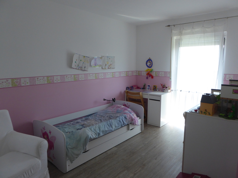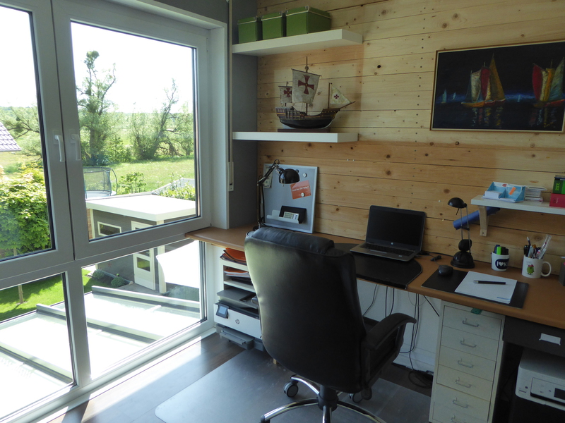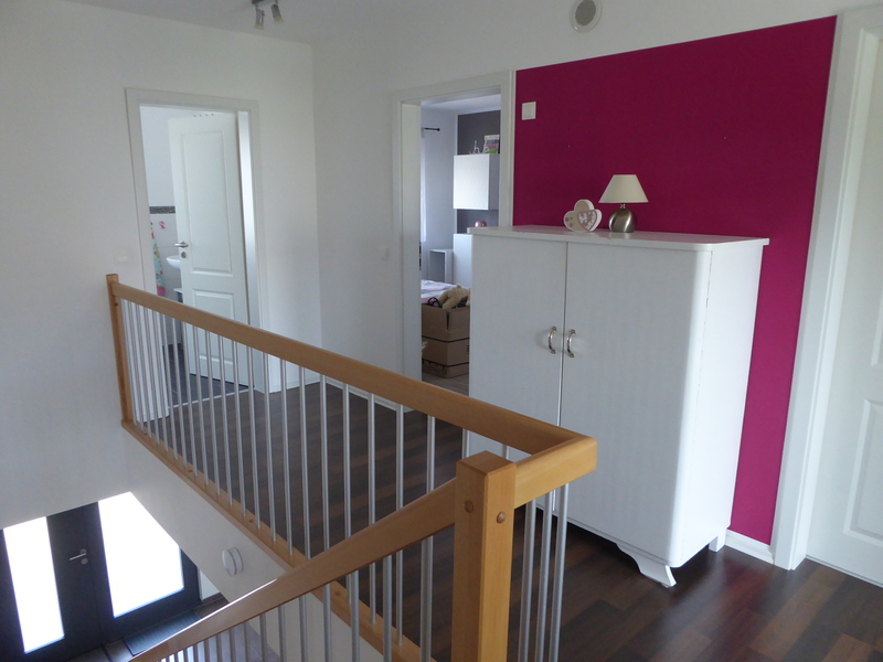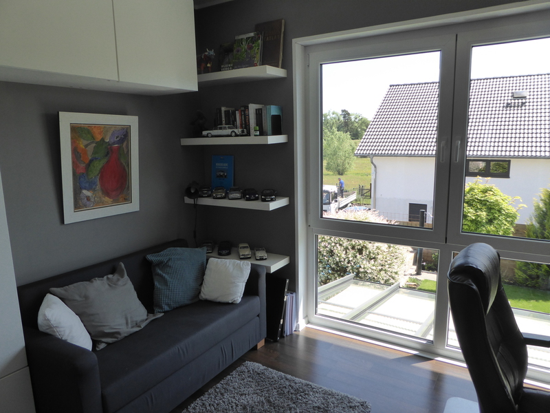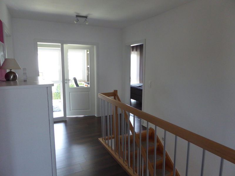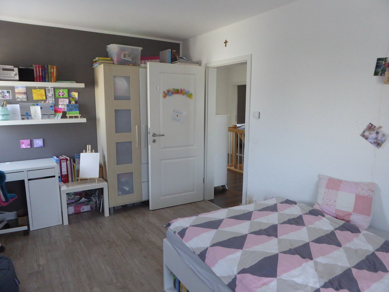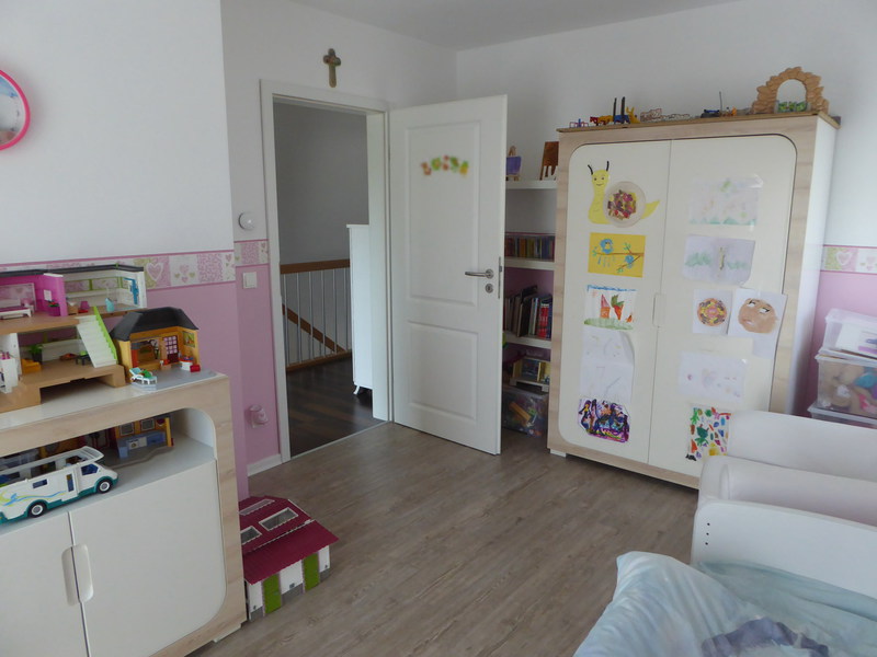 Im Obergeschoss ist das große Schlafzimmer durch einen Ankleide-/Schrank-bereich unterteilt, durch den man das großzügige Badezimmer mit großer bodenebener Dusche und Badewanne erreicht. Die beiden geräumigen Kinderzimmer verfügen über ein gemeinsames eigenes Duschbad. Das Arbeitszimmer mit großer Fensterfront bietet einen tollen Blick in den Garten und ist zum Arbeiten fast zu schade.