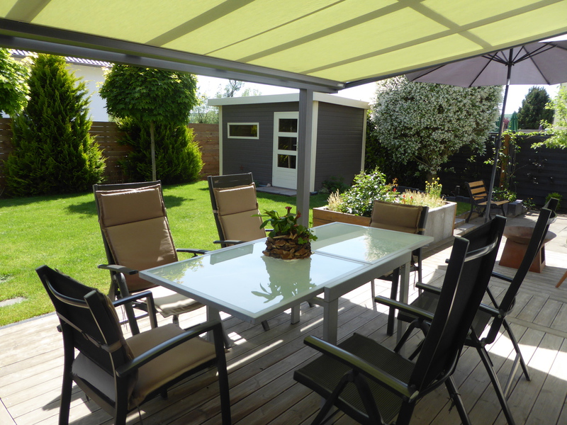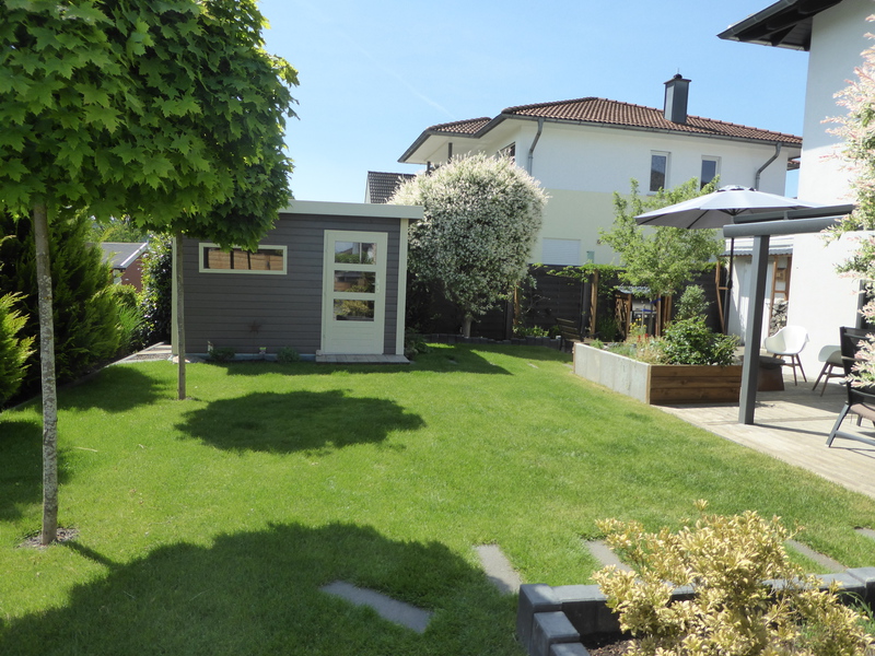 Garten und zum Haus. Das Dach der Garage ist begrünt. Vor dem Haus gibt
